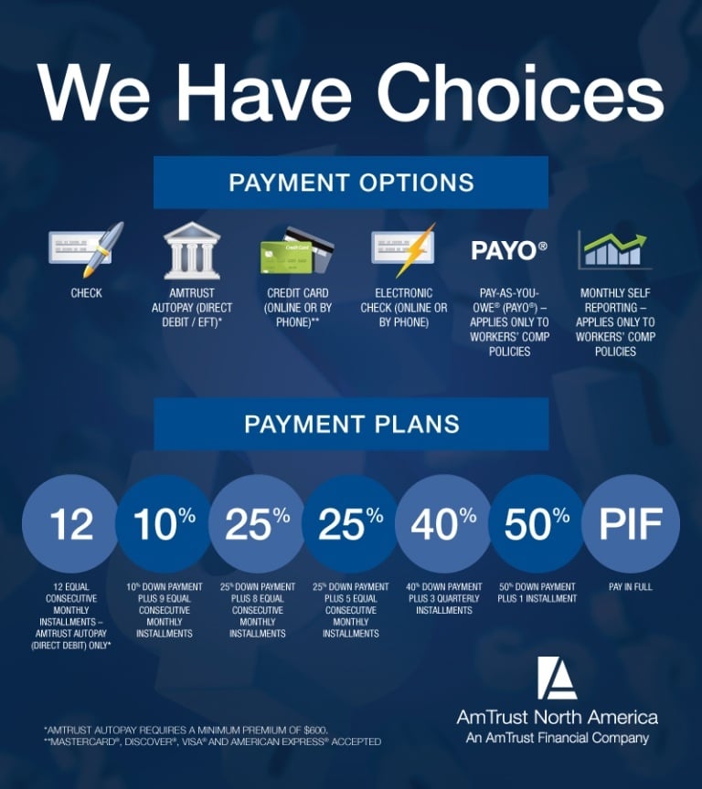 Successfully managing a small business doesn’t just involve protecting assets with the appropriate commercial insurance coverage, it also relies on the ability to maximize cash flow when managing expenses. That’s why AmTrust offers its insureds a variety of options and plans for payment.